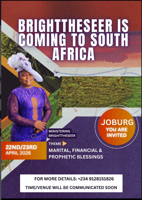 “Hello South Africa, Brighttheseer is in town — to be a blessing to you this week.” — Prophet Brighttheseer
